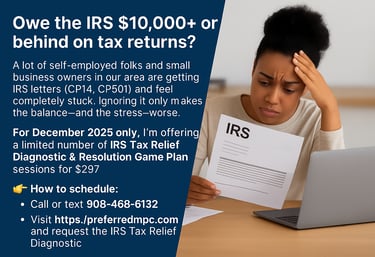 Trusted CPA specializing in IRS Tax Resolution, Tax Planning, and Fractional CFO services for small businesses and individuals. Serving New Jersey, Maryland, and beyond with professionalism and results.